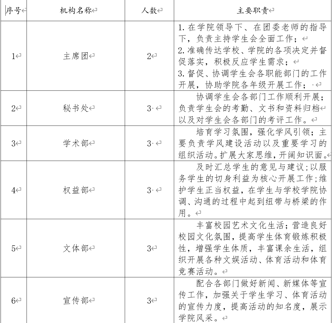 (三)学生会共设置5个职能部门,分别为秘书处、权益部、学术部、宣传部、文体部。
