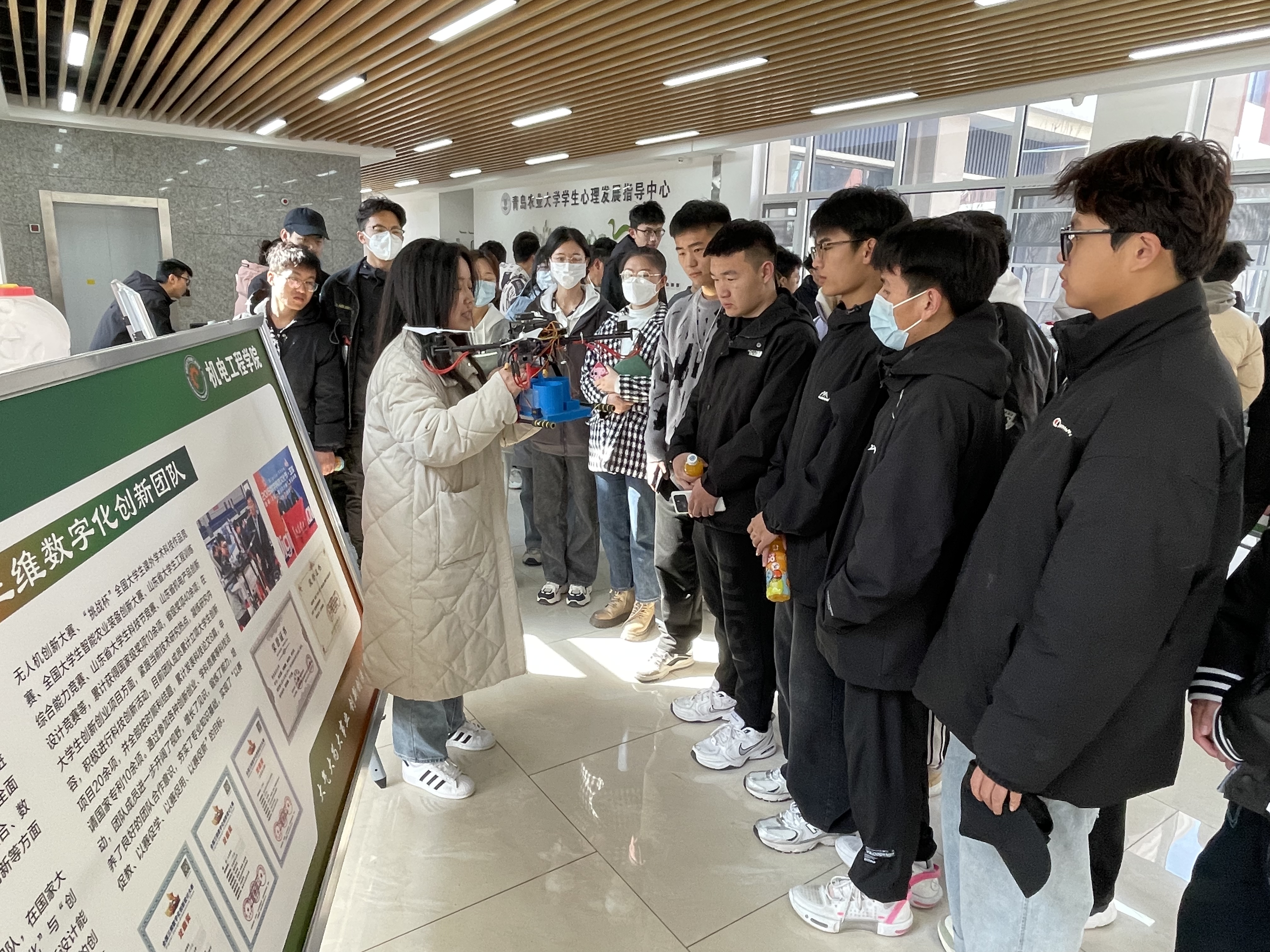 三维数字化创新团队智能配送无人机团队研制展示了多旋翼智能无人机,该无人机能够自主或遥控完成“识别货物、搬运货物、越障、投递货物”等任务。推介过程中很多同学对无人机项目展现出浓厚的兴趣,他们与项目负责人就自主定位、路径规划、目标识别等方面展开了积极交流,这大大激发同学们的创新创造热情。