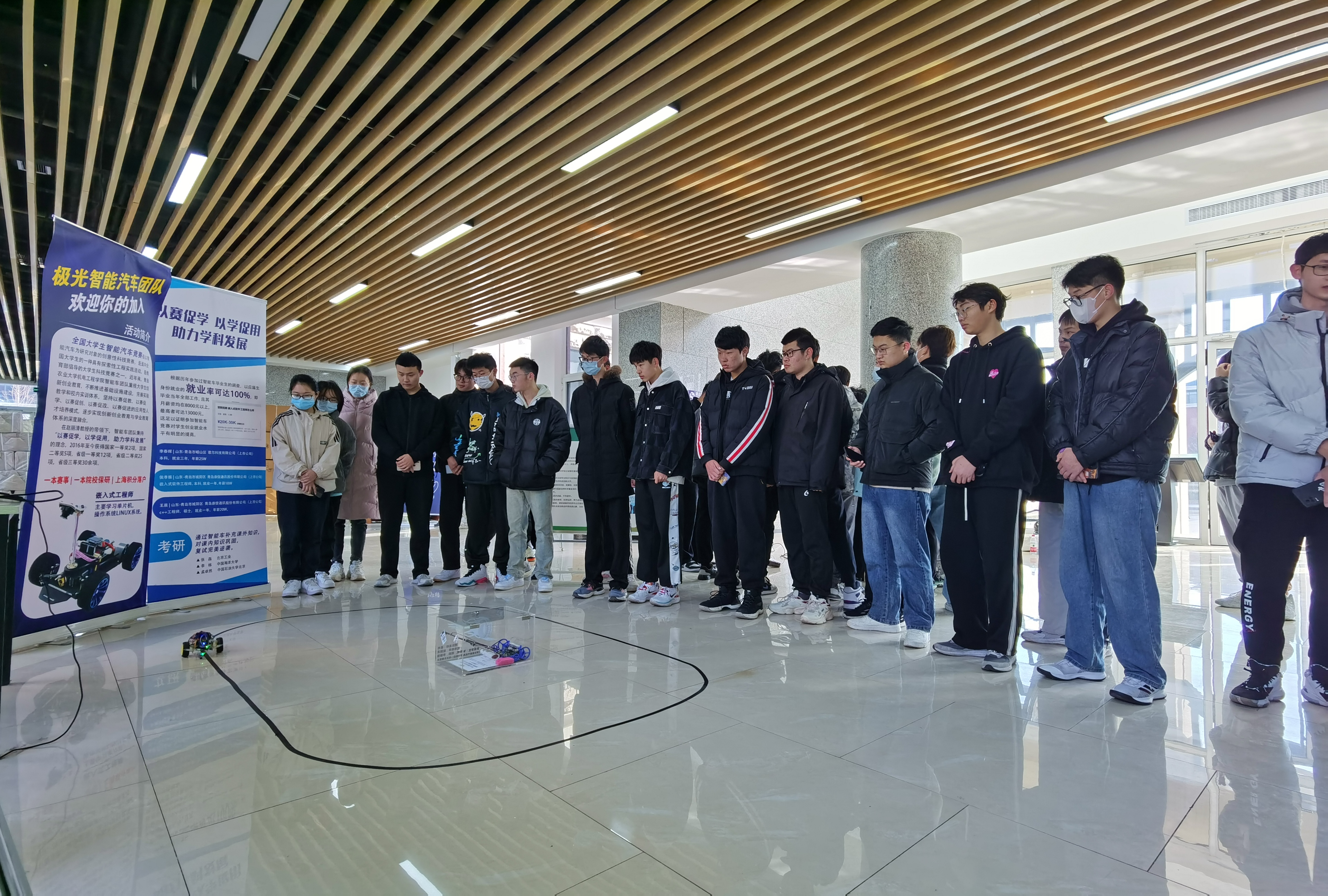极光智能汽车带来第14届中国智能车的比赛车和以前做的车模,同时为同学们讲解了智能车的原理,并在现场通过实物模型来讲解智能车工作原理、运行机制等,很多同学被项目吸引,纷纷上前咨询。