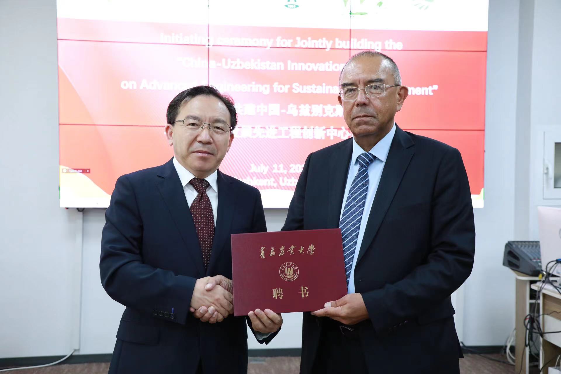 启动仪式上,双方签署了中心共建协议,共同为“中国—乌兹别克斯坦农业可持续发展先进工程创新中心”揭牌。赵金山为阿利姆·普拉托夫颁发了英国365官方网站客座教授聘书。