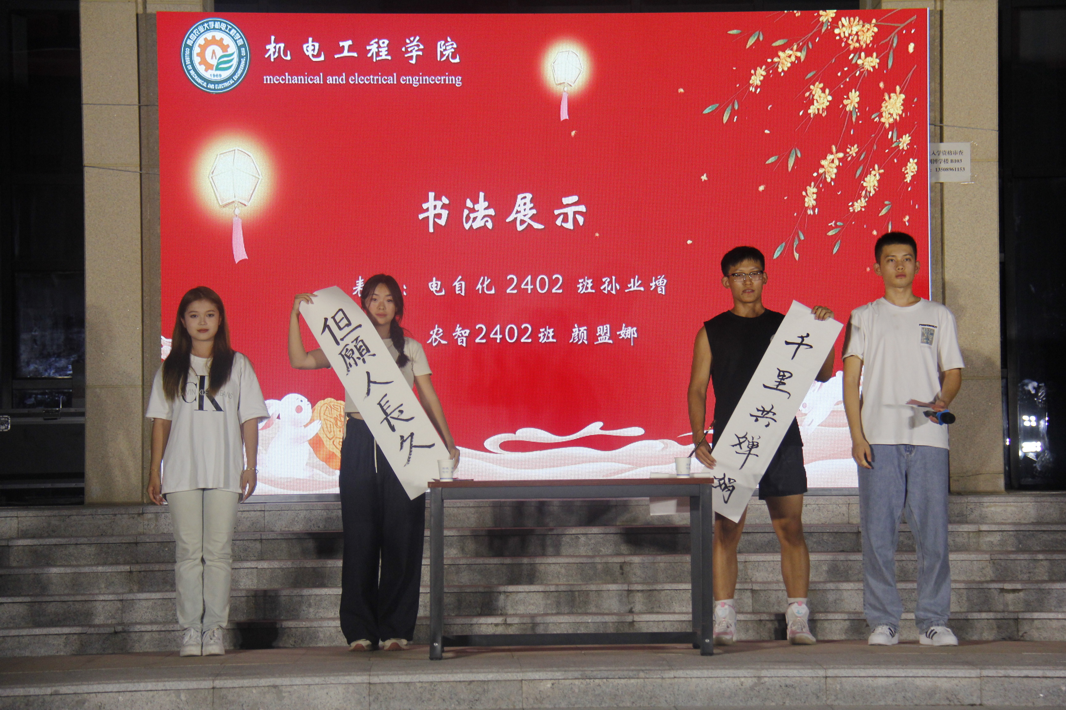 在中秋集体生日会环节,全体人员为学院6名同学齐唱生日歌,王海燕与6名同学齐切生日蛋糕并送上生日祝福;在中秋话未来环节,同学们交流回顾入学以来的学习和生活,分享了将来大学四年的规划。农机化2401班贵州籍王安邹同学表示入学以来感谢学院老师同学们的关心及帮助,让他们中秋节在新的地方同样有家一般的温暖。晚会在《一路生花》大合唱中落下帷幕,学生们手牵手,心连心,用歌声传递着对中秋佳节的美好祝愿。