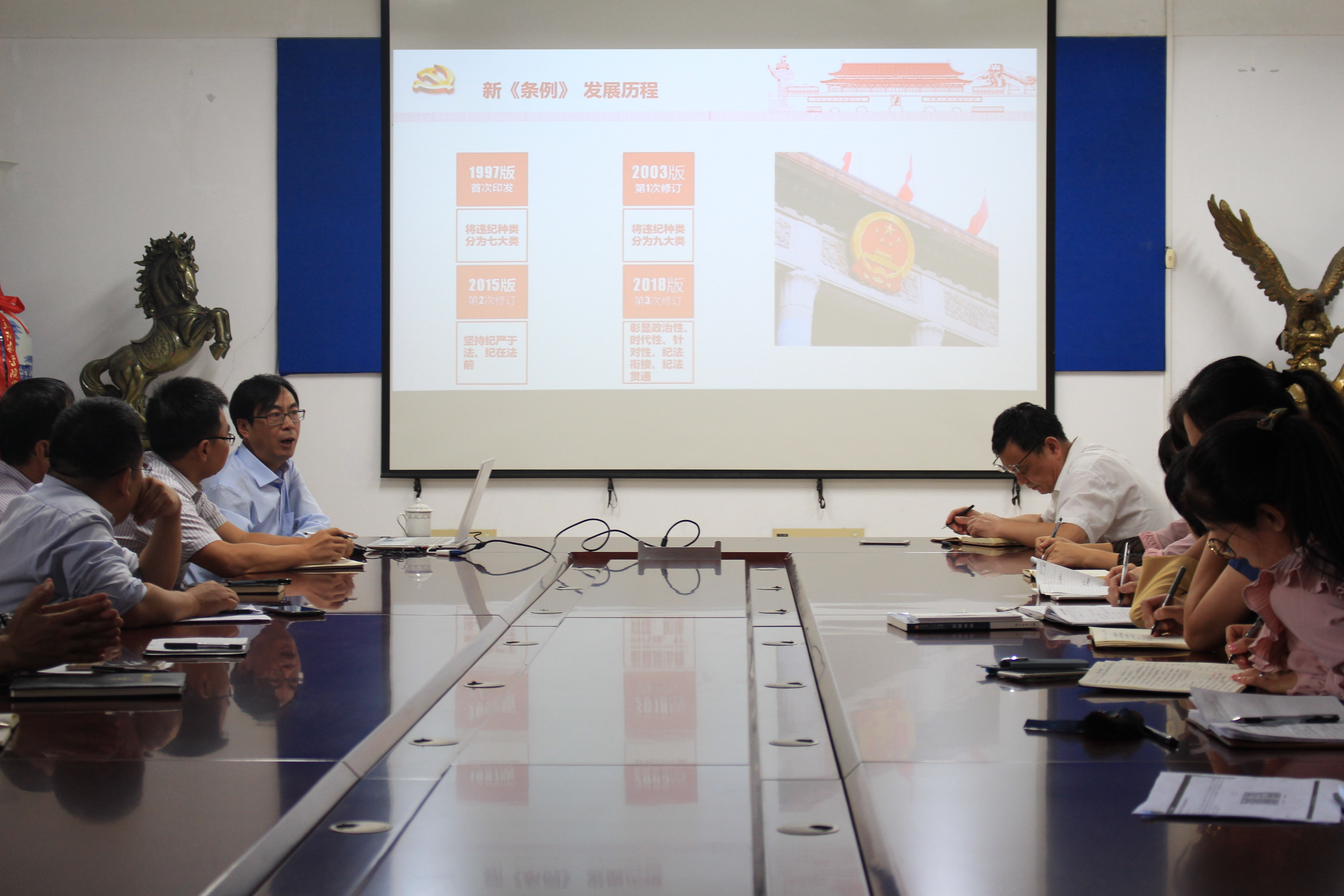 赵奎皓从发展历程、背景意义、修改重点、纪律底线四个方面对新修订《条例》进行了全面解读。深刻阐述了新修订《条例》的重要历史意义、三大作用、八大亮点和新内容新特点,详细列举了纪律“高压线”的具体内容,让全体教职工对新修订《条例》有了全面深刻地理解和认识。